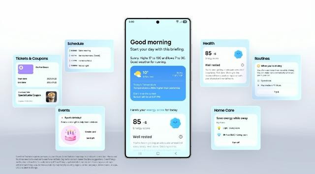 此外,“即时简报”功能提供了全新的个性化日程管理体验。从清晨开始,用户就能通过简报查看前一天的睡眠数据、当天的天气预测、待办事项以及重要提醒;而在晚上,系统还会生成总结简报,包括一天的重要回忆或即将到期的优惠券提醒,让用户对第二天的安排了然于心。